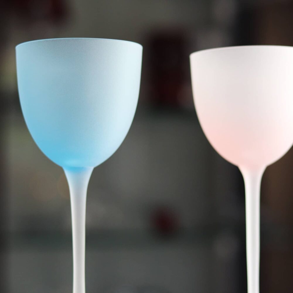 Nous avons sublimé cette série de 5 verres en cristal de couleur rose à travers le sablage.